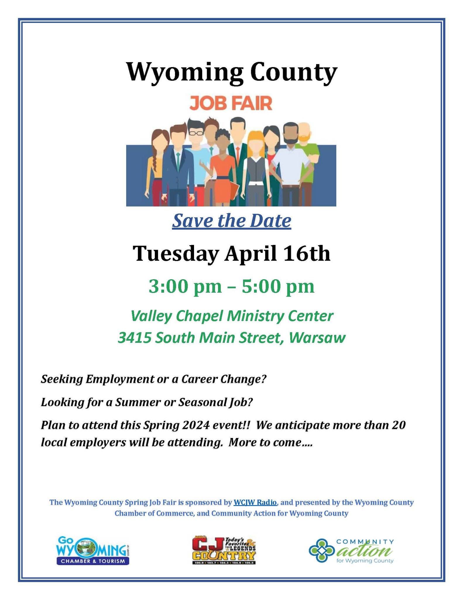 The Wyoming County Spring Job Fair is sponsored by WCJW Radio, and presented by the Wyoming County Chamber of Commerce, and Community Action for Wyoming County. Are you having a difficult time finding employees? Are you looking for a low-cost and effective way to reach out to potential employees and showcase your business at the same time?
