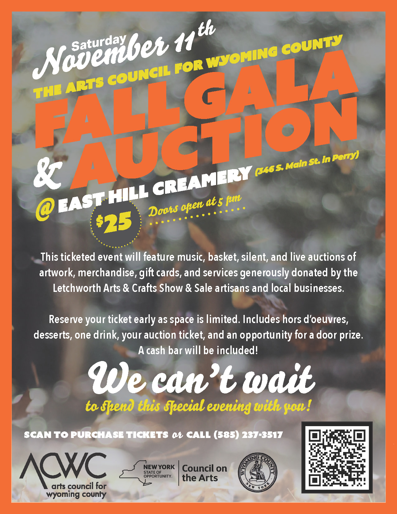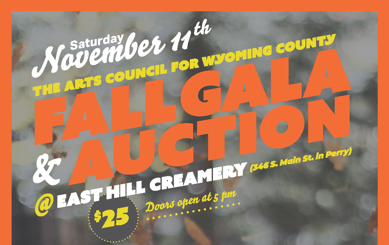 ACWC’S GALA & AUCTION The Arts Council for Wyoming County Gala Fundraiser and Auction will be held on Saturday, November 11, at the East Hill Creamery at 346 S. Main St. in Perry, NY. This ticketed event will feature music, basket, silent, and live auctions of artwork, merchandise, gift cards, and services generously donated by the Letchworth Arts & Crafts Show & Sale artisans and local businesses. The event's proceeds will support many youth programs, including two annual all-county art exhibitions, the summer youth art camp, and much more.