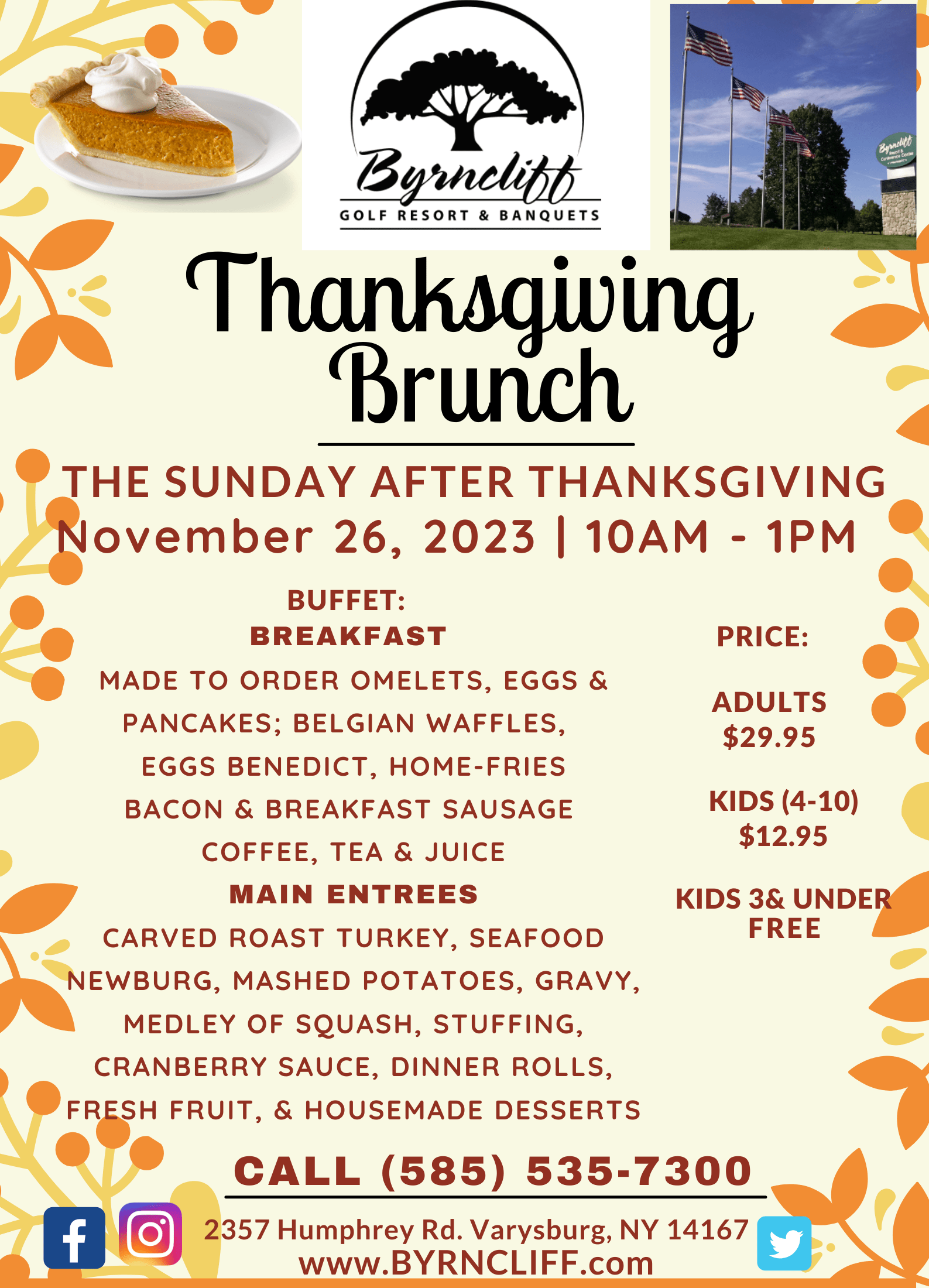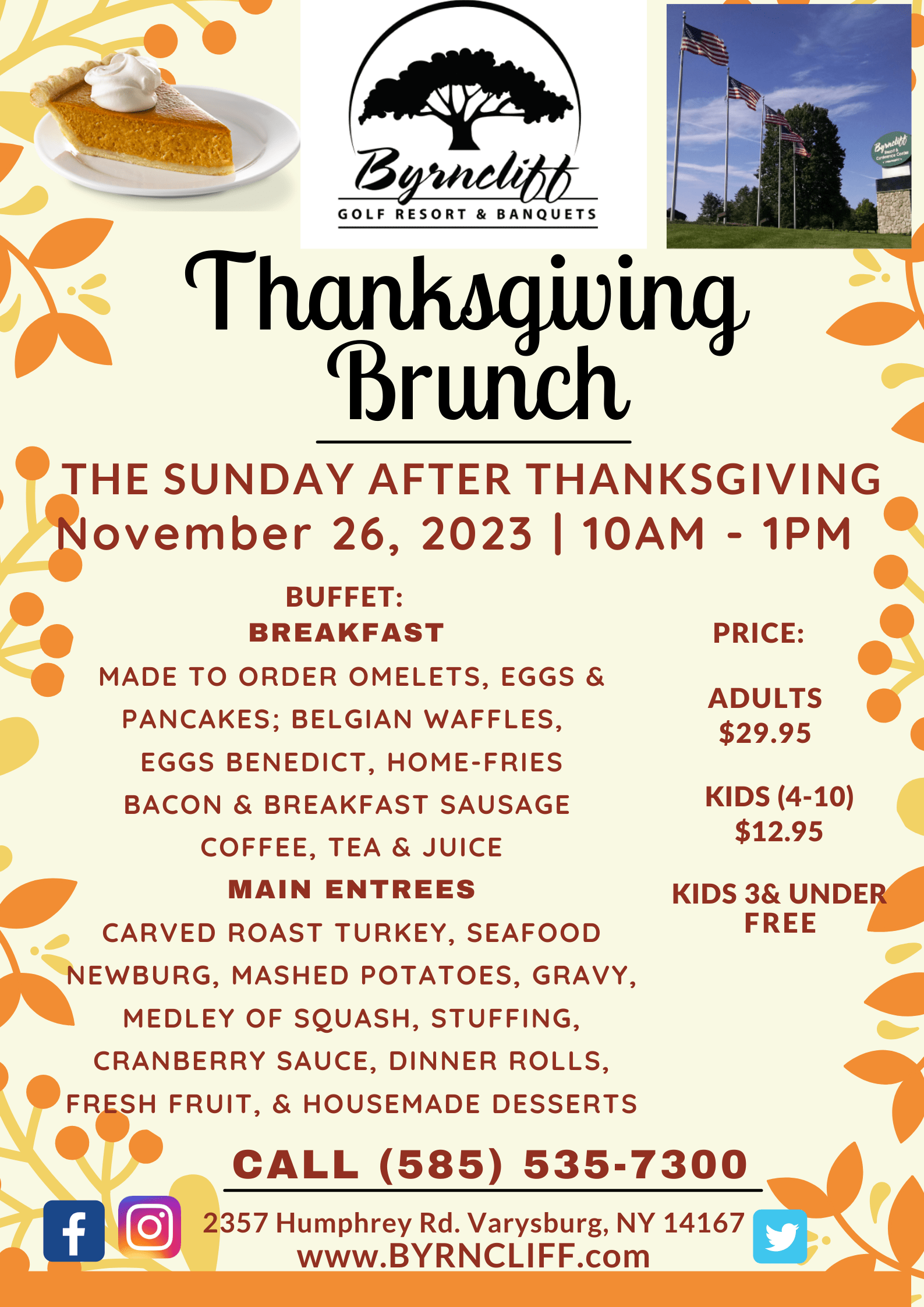 Sunday Nov 26th 10 am 1 pm At Byrncliff Golf Resort & Banquets, Varysburg, NY Brunch Buffet $29.95Images