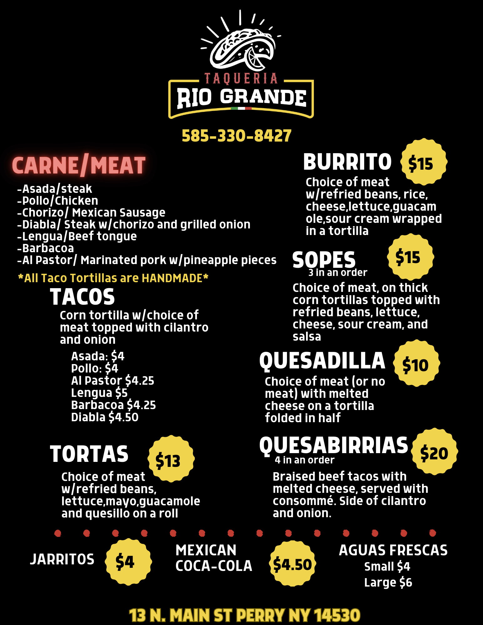At Taqueria Rio Grande, we’re here to create a place where you can come together, enjoy incredible food, and experience the spirit of Rio Grande, Oaxaca. Whether you’re a local or visiting from afar, we want you to feel like family, enjoy every bite, and leave with a smile.
